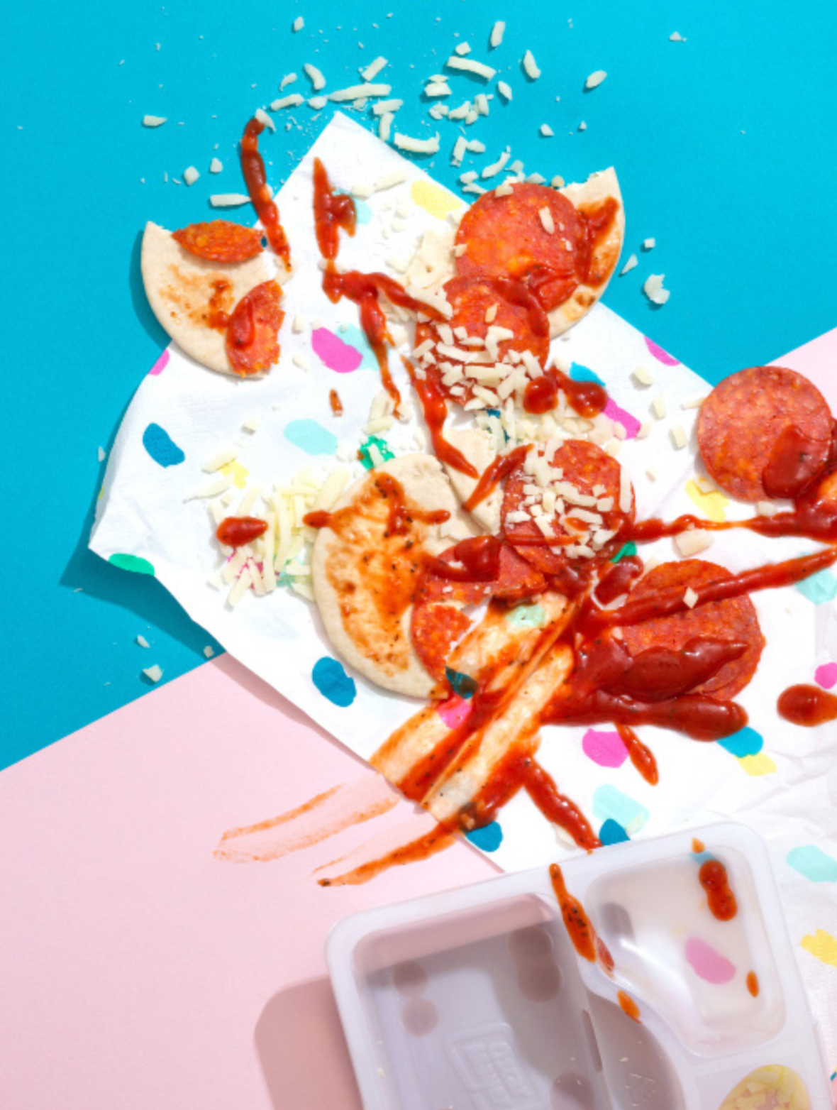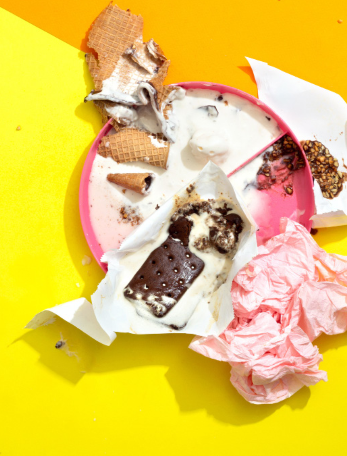To pay homage to these treats while highlighting my conflicted relationship with them, I’ve photographed these foods in all their saccharine beauty. Deconstructed Nutty Buddies, Fruit by the Foot wrappers, and Cheeto dust play alongside brightly colored acrylic containers, pat- terned backdrops, and paper napkin surfaces. Because despite their synthetic ingredients and empty calories, they’ll forever hold a wholesome place in my heart.